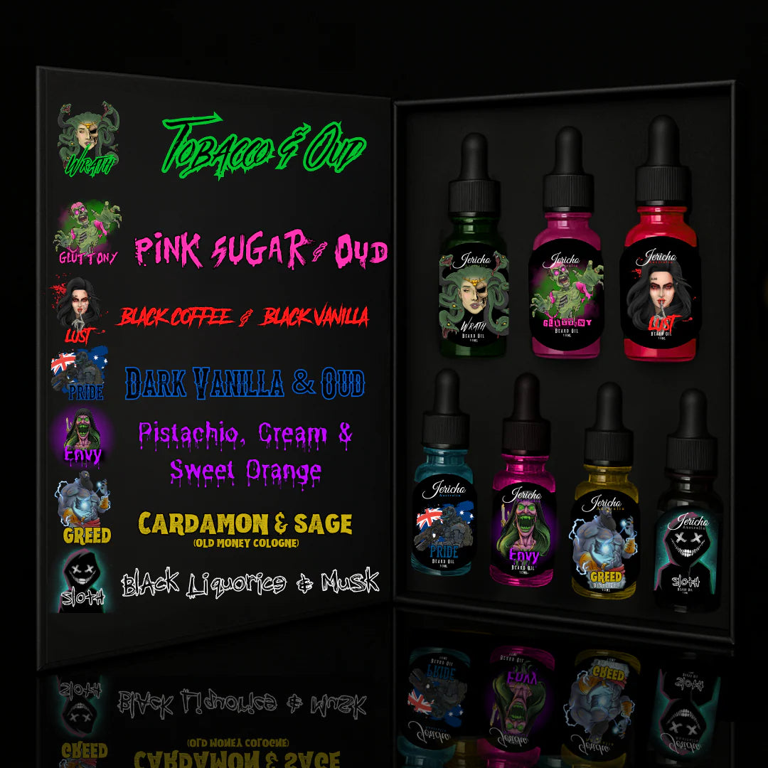 The 7 Deadly Sins Book is a collector’s masterpiece, a premium, book like display case that holds all seven of Jericho’s infamous 7 Deadly Sins beard oils. Each 10ml bottle represents a deadly vice - Wrath, Greed, Lust, Envy, Pride, Sloth, and Gluttony — brought to life through rich, intoxicating scents that tempt, challenge, and consume.